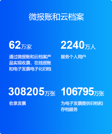 微宝账整合电子发票采集、查验、云存储、交付流转、归档、报销、采购付款等产品、云计算资源及增值服务,帮助合作伙伴快速搭建业财税票档一体化云平台,为合作伙伴的客户提供基于全票种、全财税应用场景的发票全生命周期数据管理服务。