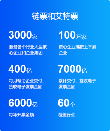 链票自上线运营以来,已经服务了1000+各个行业大型核心企业和企业集团,通过核心企业链接上下游企业超过100万家,链票平台每月帮助企业客户交付、签收电子发票超过400亿元,累计交付、签收电子发票超过7000亿元,每年支持供应链交易金额超过50,000亿,链票API每年被请求超过1亿+次。